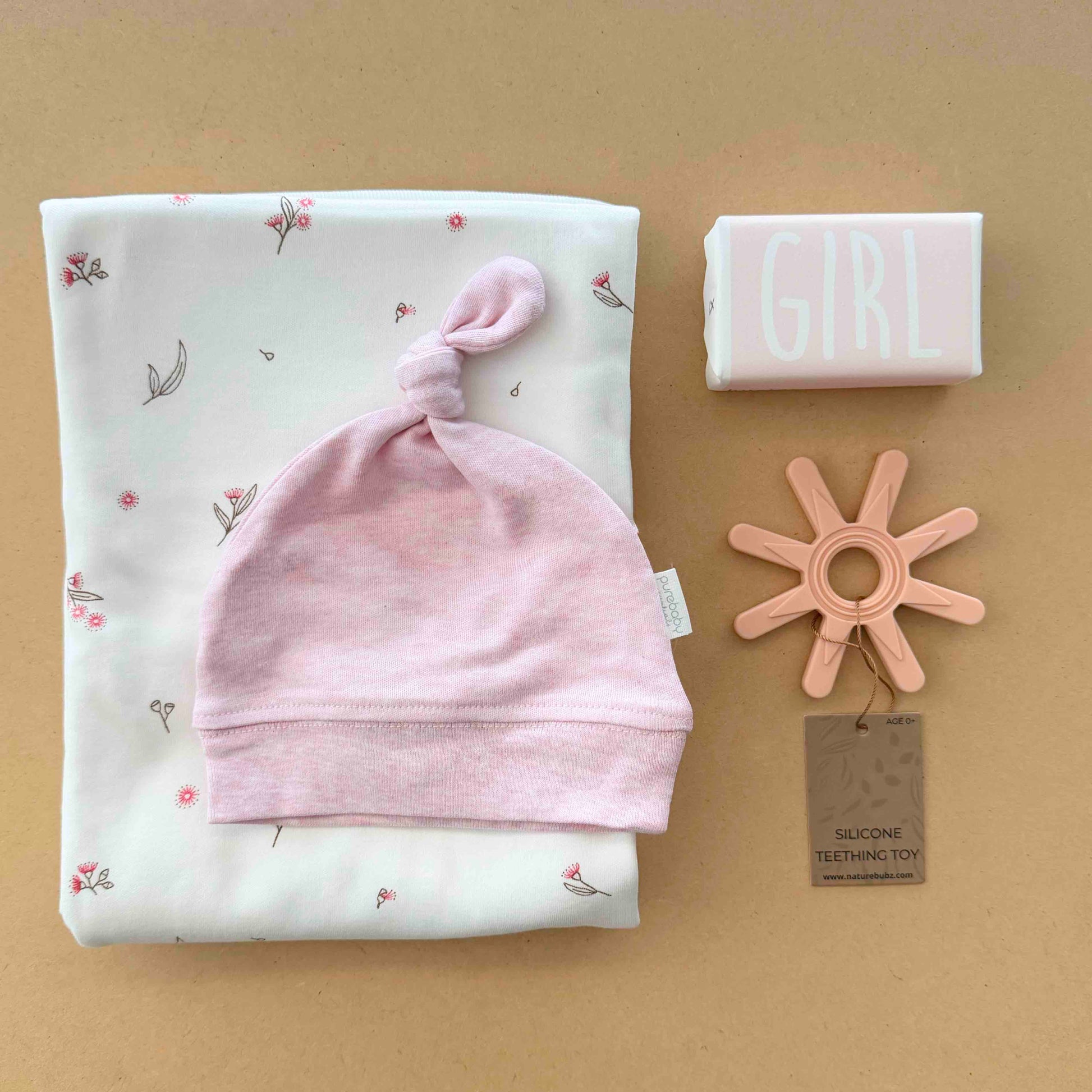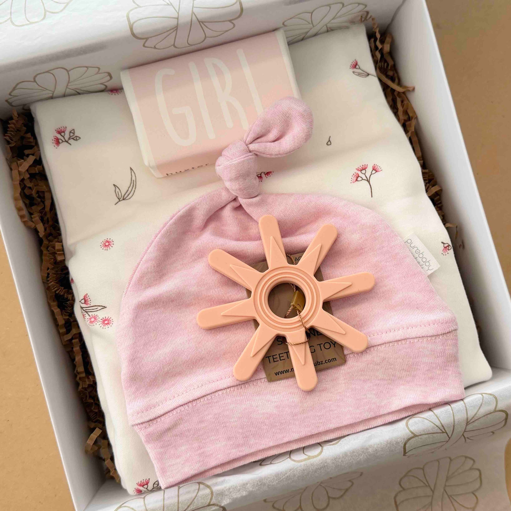 Welcome the arrival of a baby girl with this comforting little bundle of goodies.