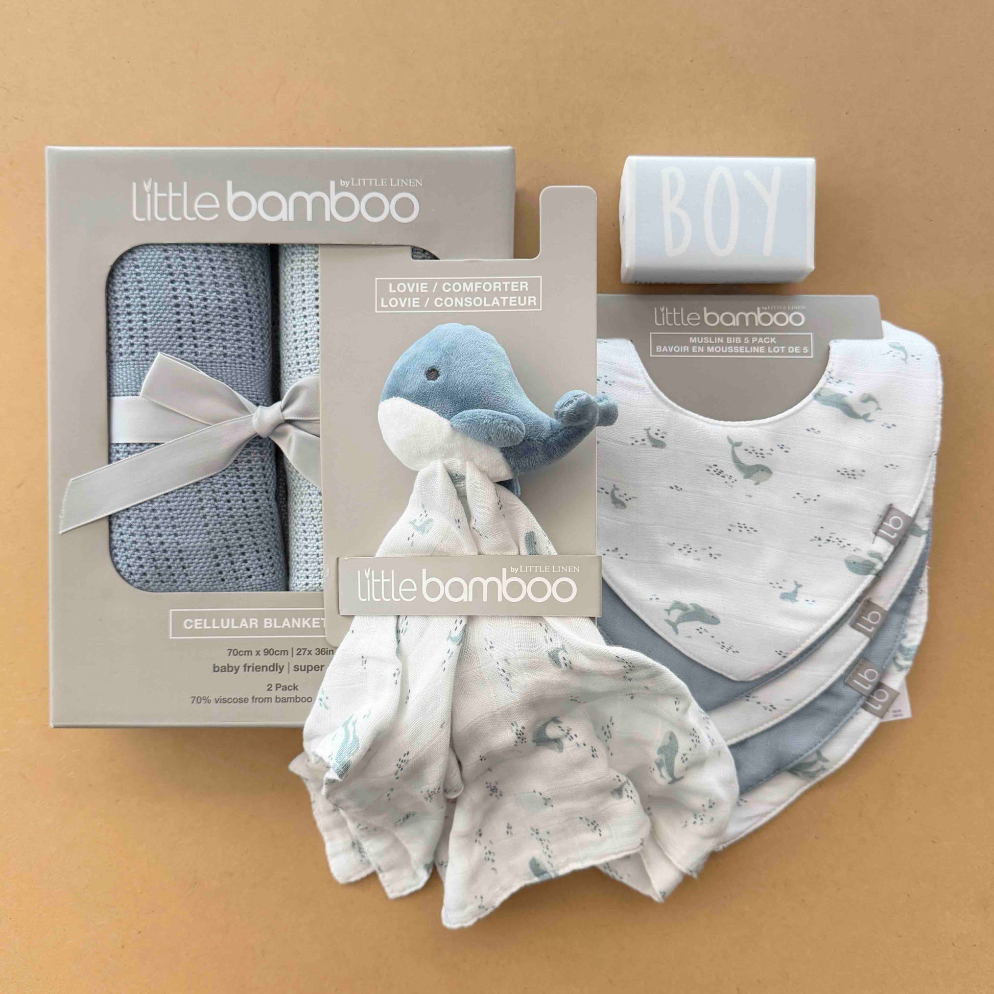 Beautifully delicate bamboo baby basics are the heart of this gift, welcoming baby with a soft landing in life!