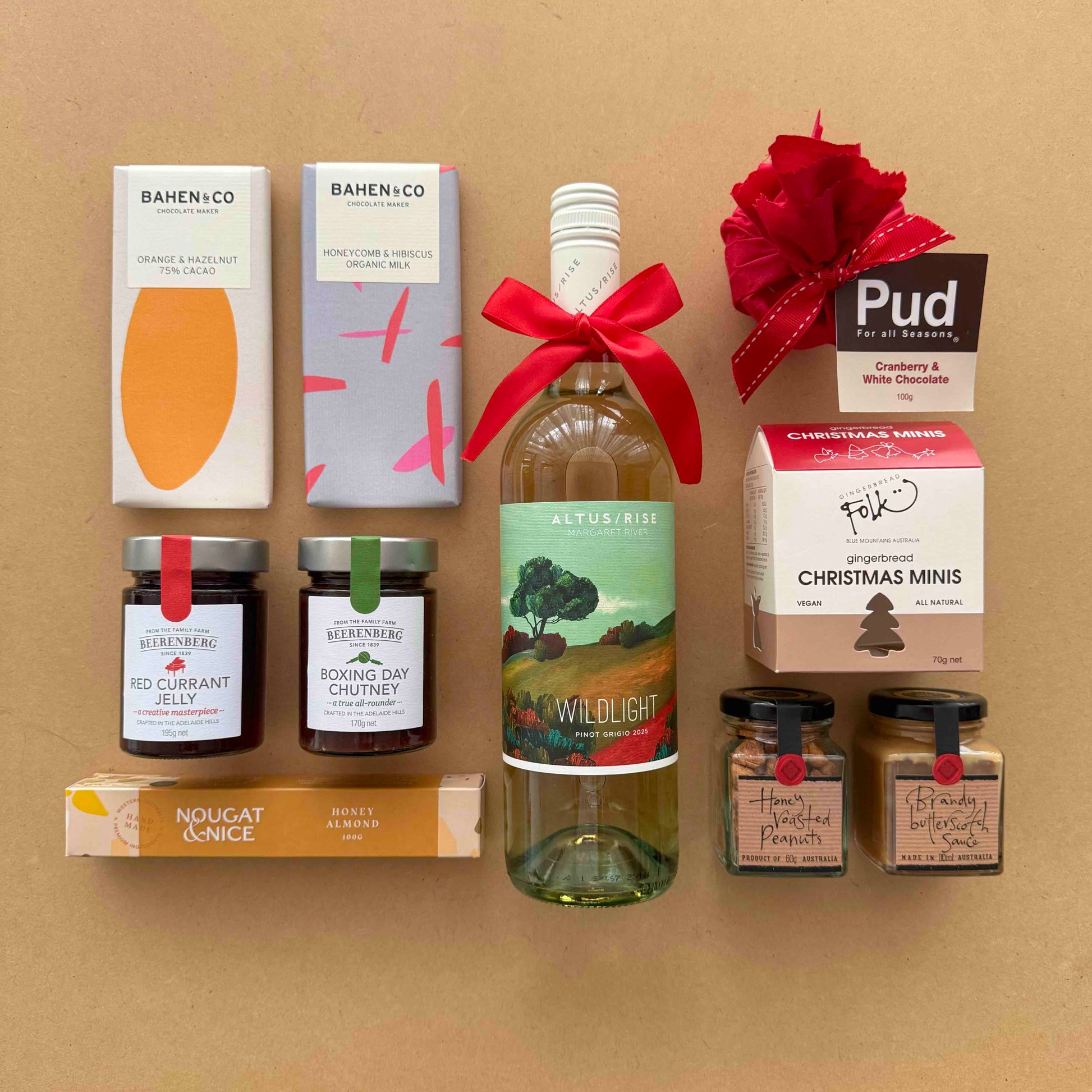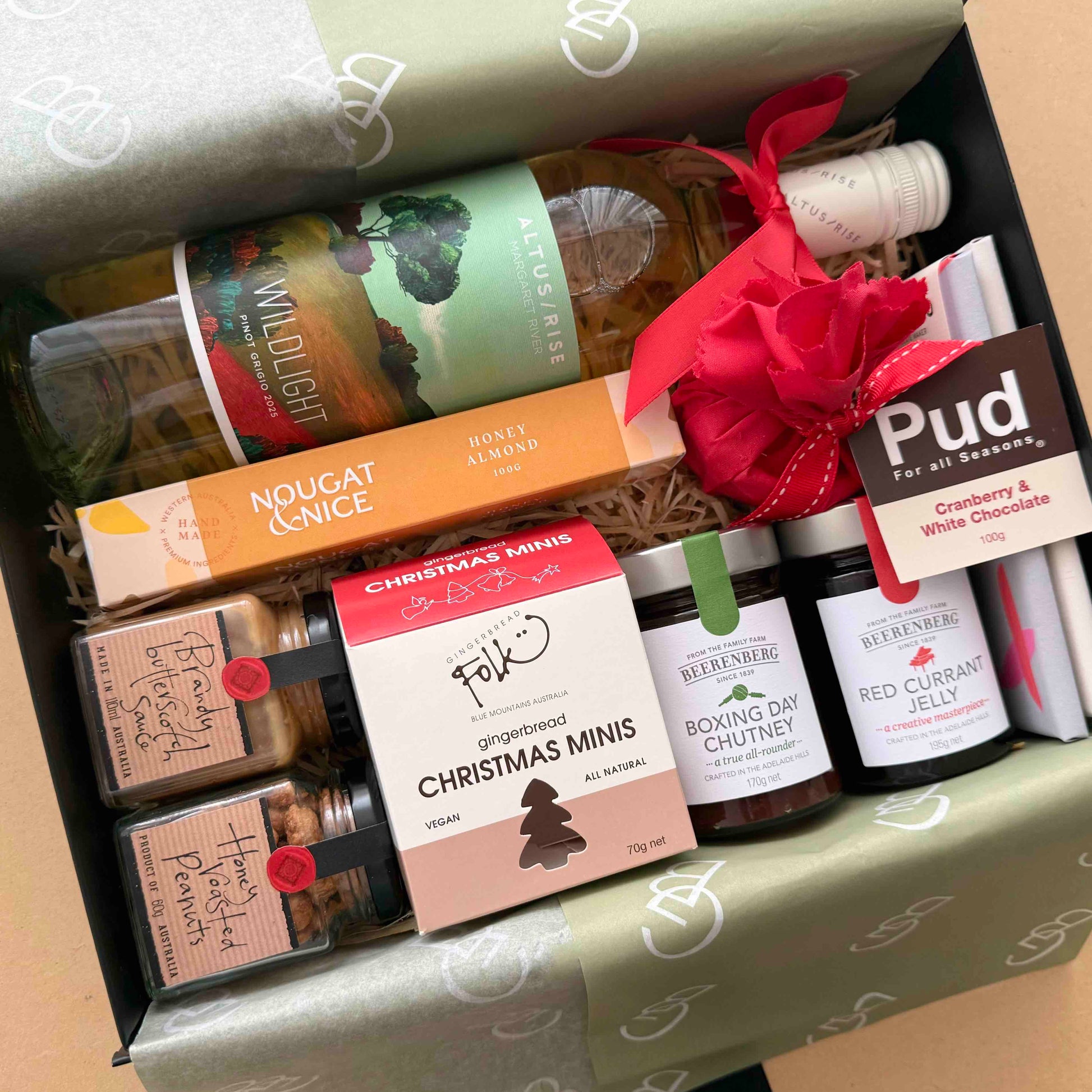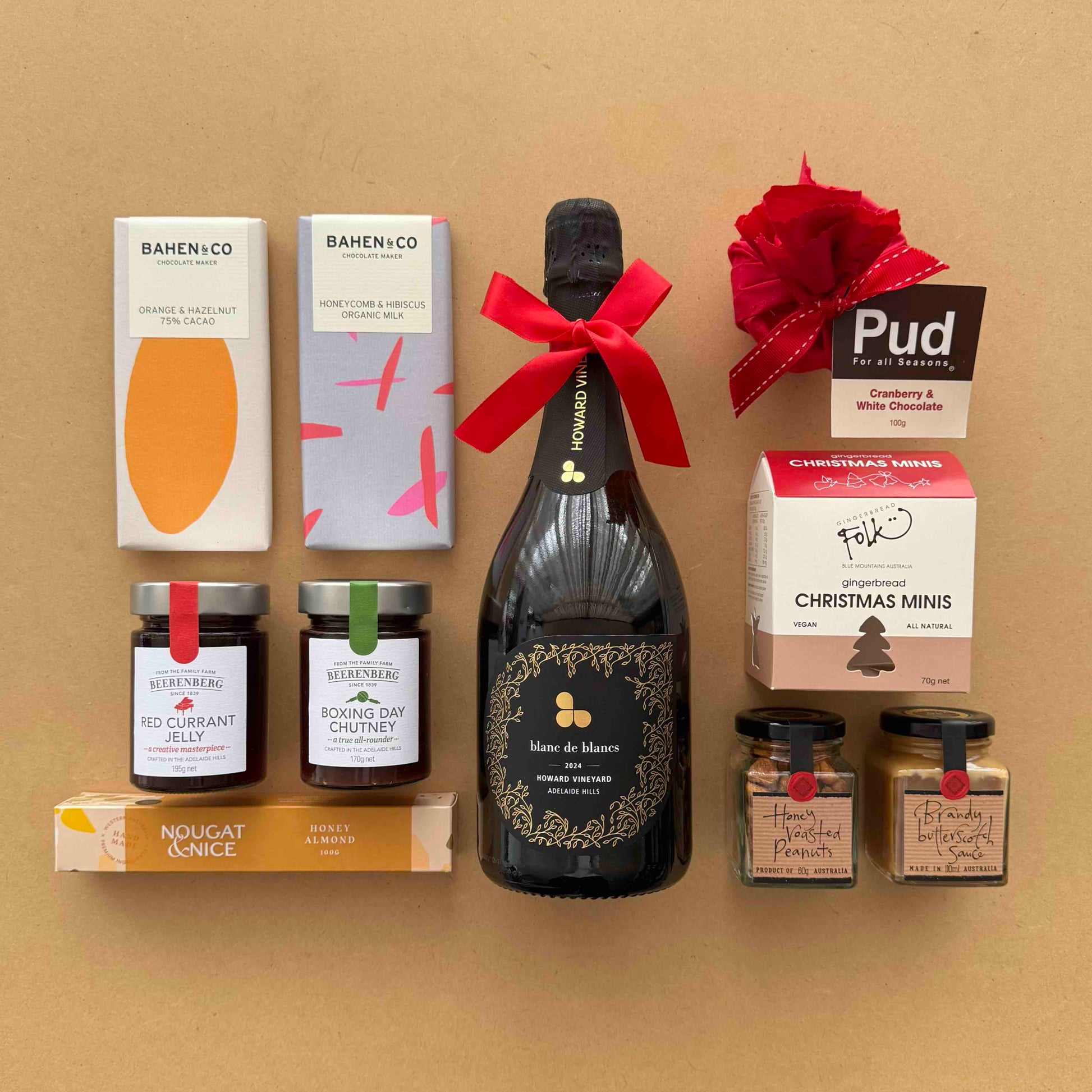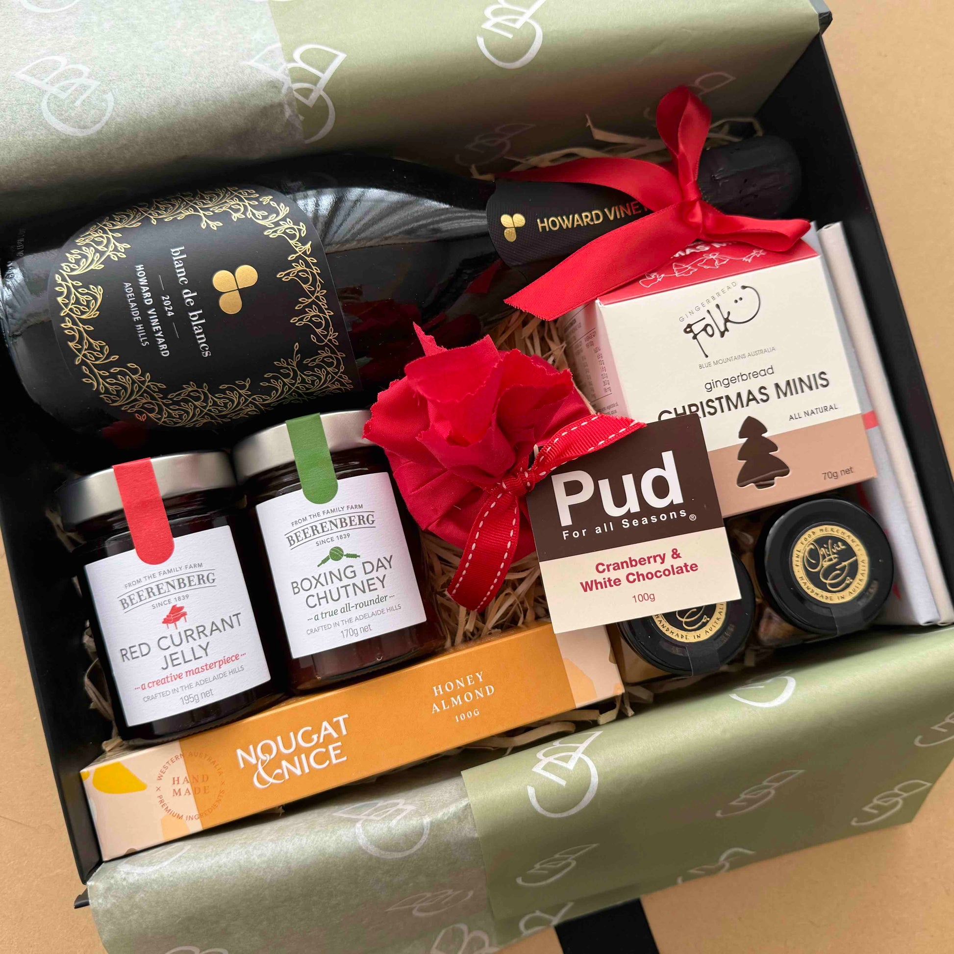 A collection of classic Christmas gourmet goodies, from sweet treats like pudding, nougat, gingerbread and chocolates, through to condiments to accompany the festive table, such as redcurrant jelly and the aptly named 'Boxing Day Chutney', perfect to enjoy with all the leftovers the next day!