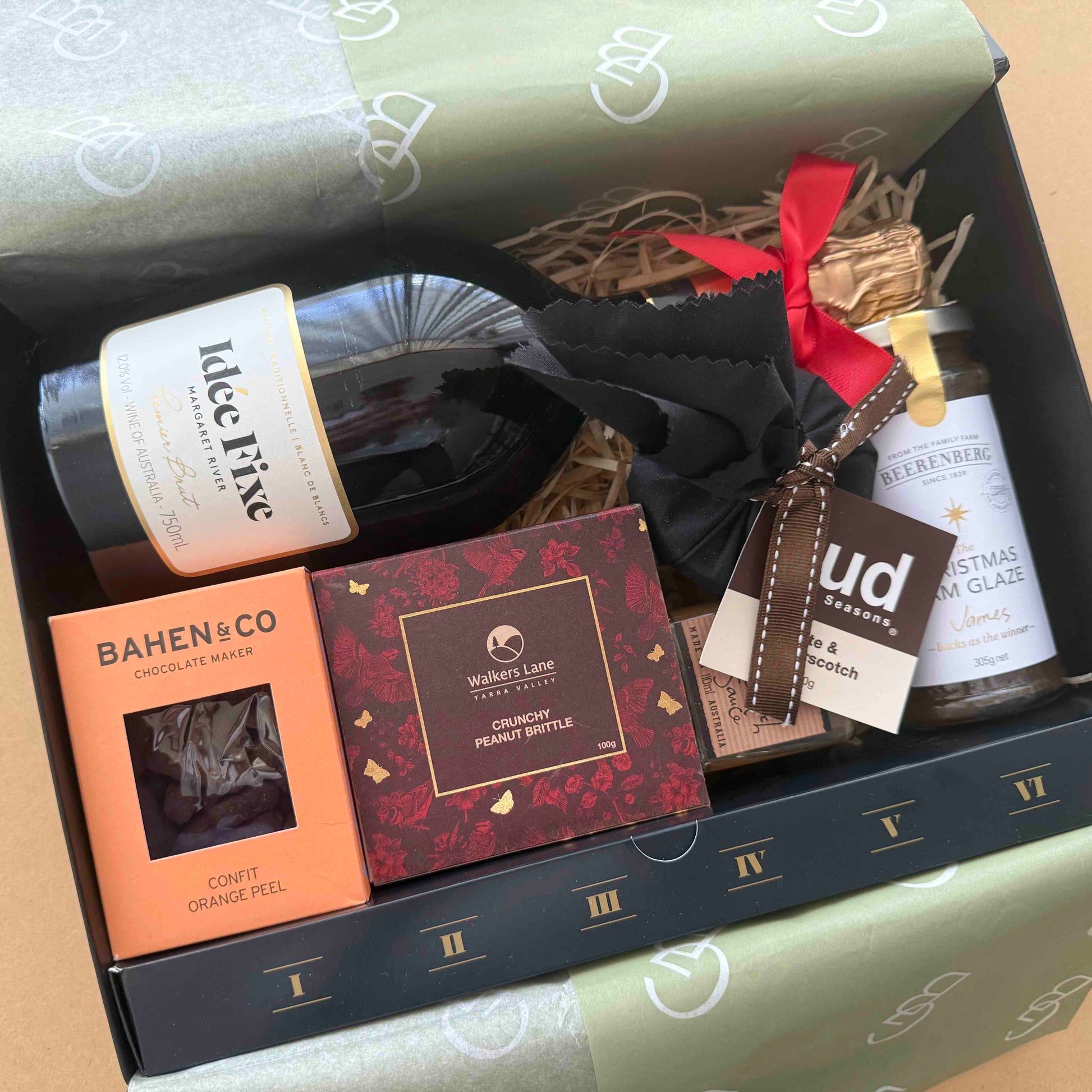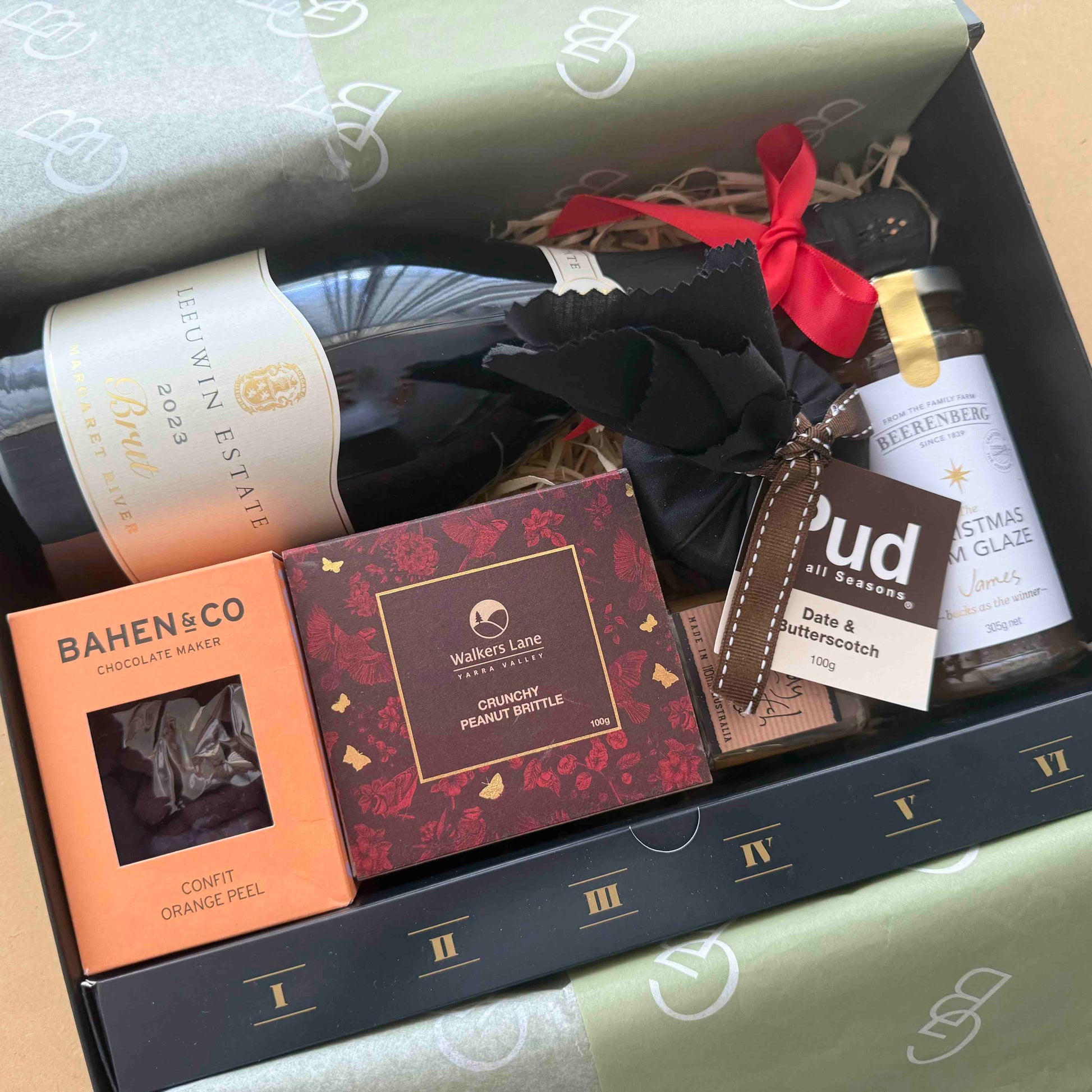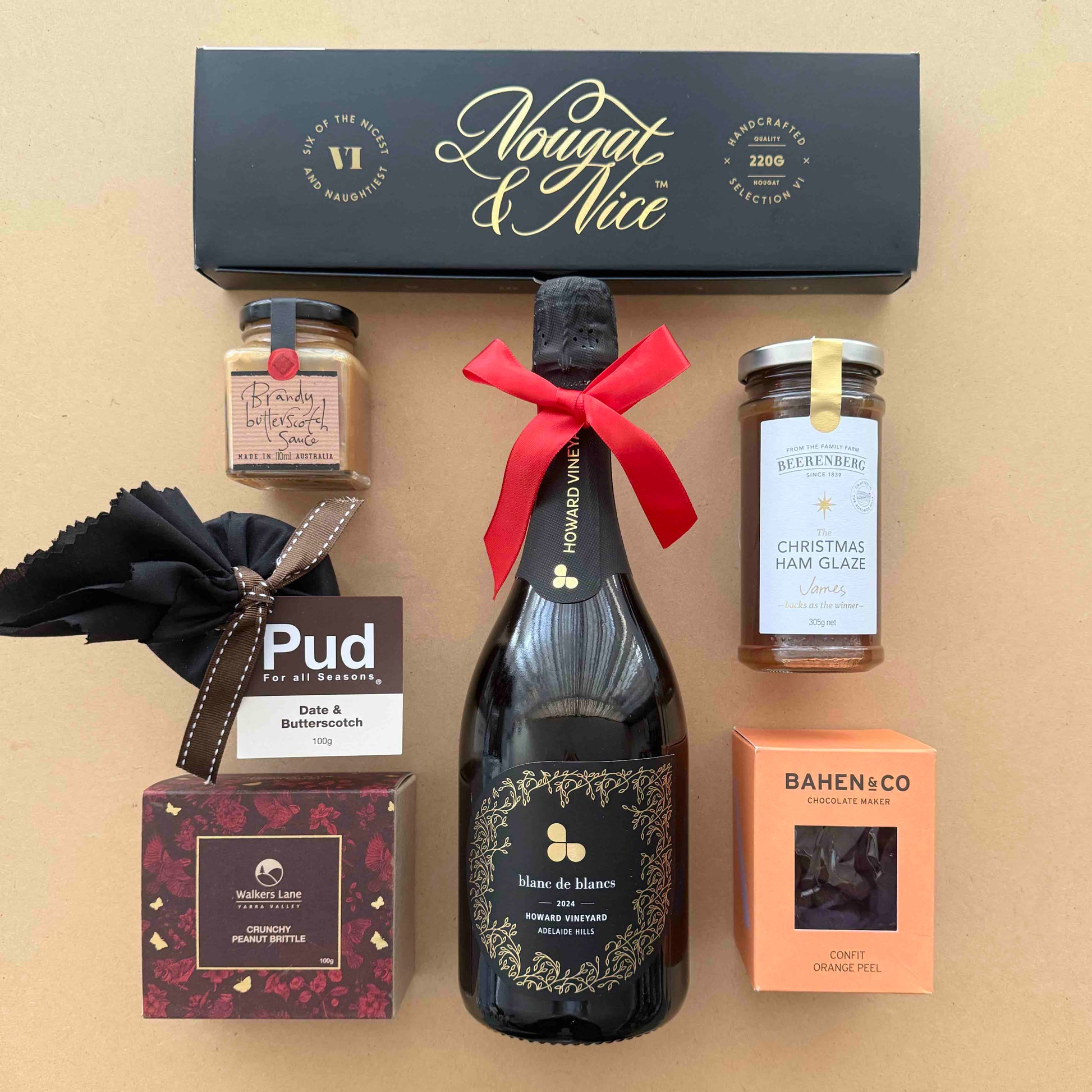 An elegant gift hamper filled with the highest quality treats for the season, and some sparkling to celebrate!