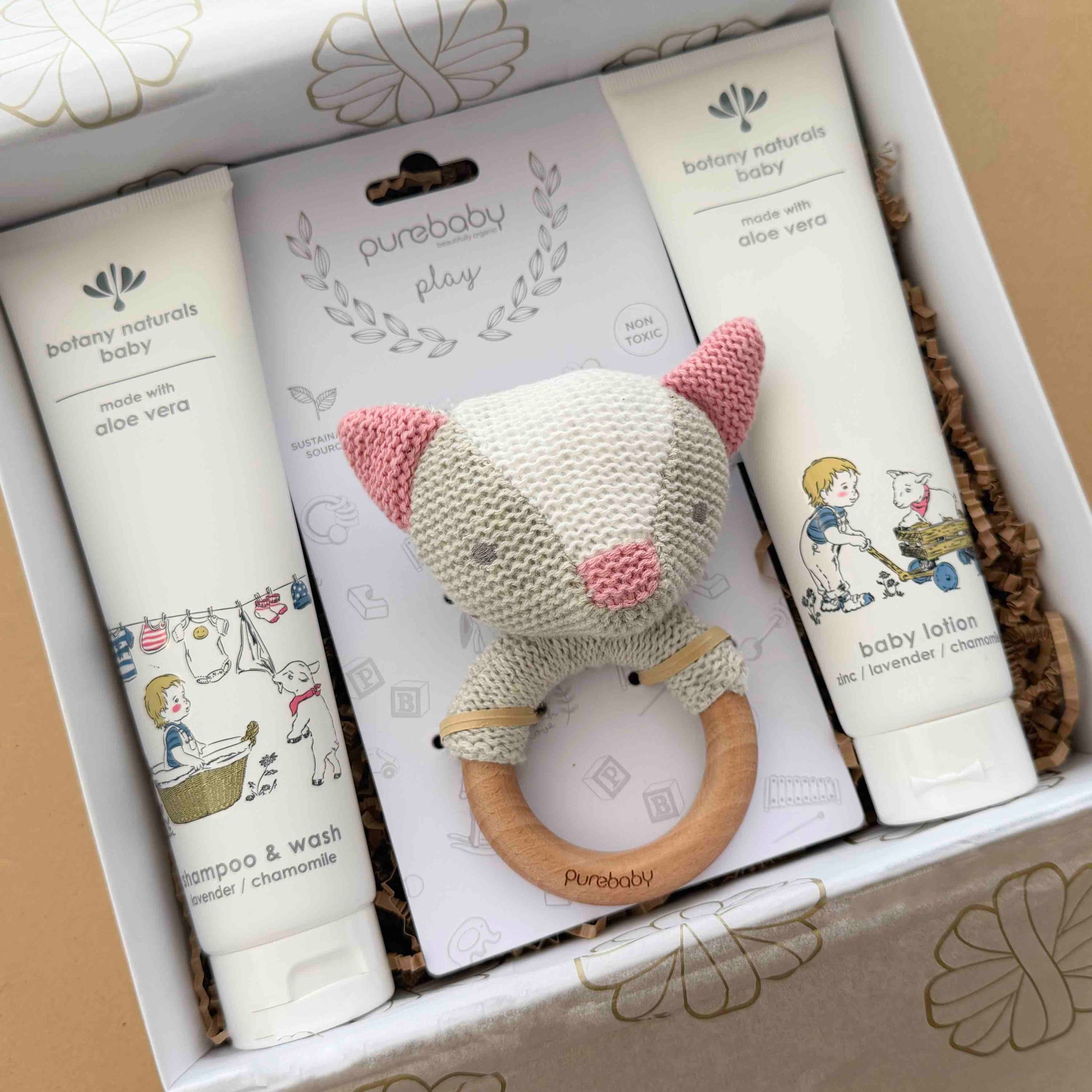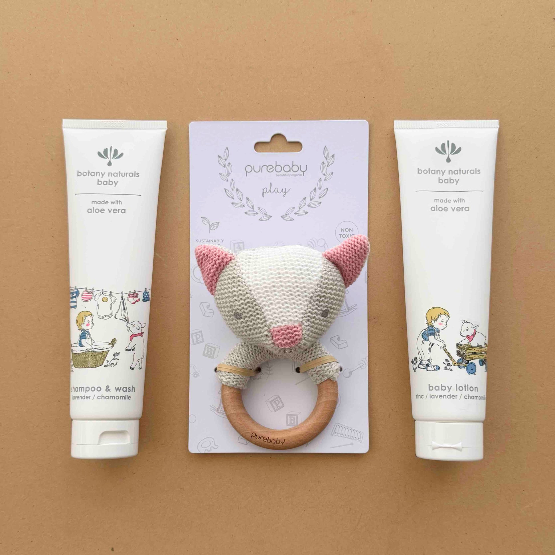 Featuring an organic cotton Possum crochet rattle toy by Pure Baby, that is easy to grasp and makes a gentle, entertaining sound for bub.