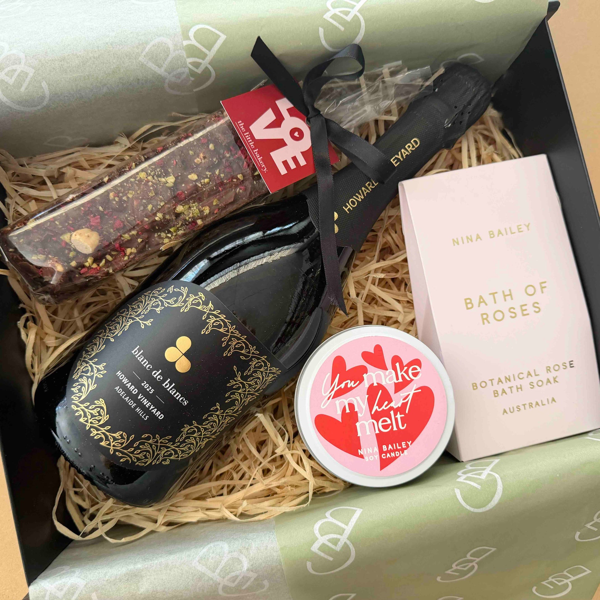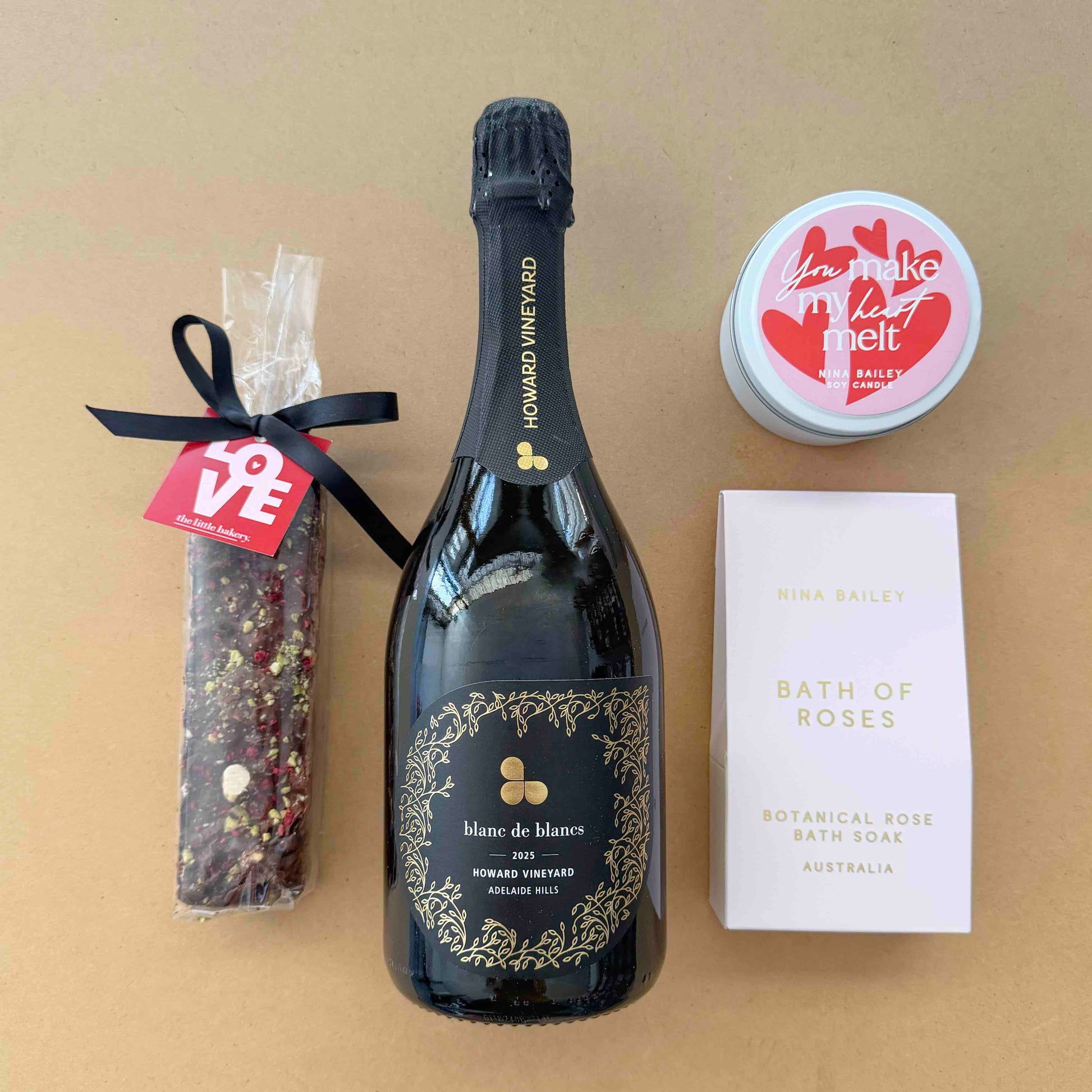 The must have pop of sparkling wine adds a sense of occasion, coupled with a decadent rocky road by The Little Bakery to indulge in.