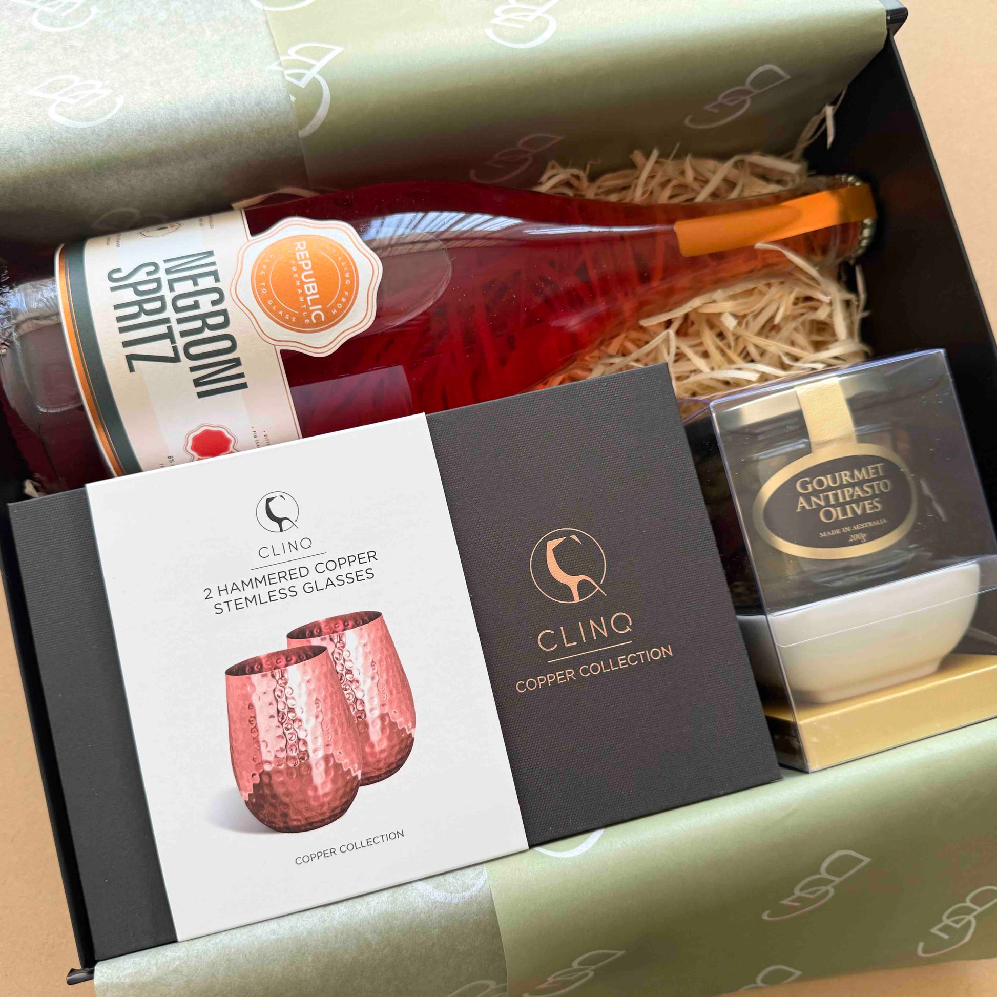 Boxed together with a pair of the beautiful gold hammered stemless glasses by Clinq, and some gourmet olives and serving dish to accompany.