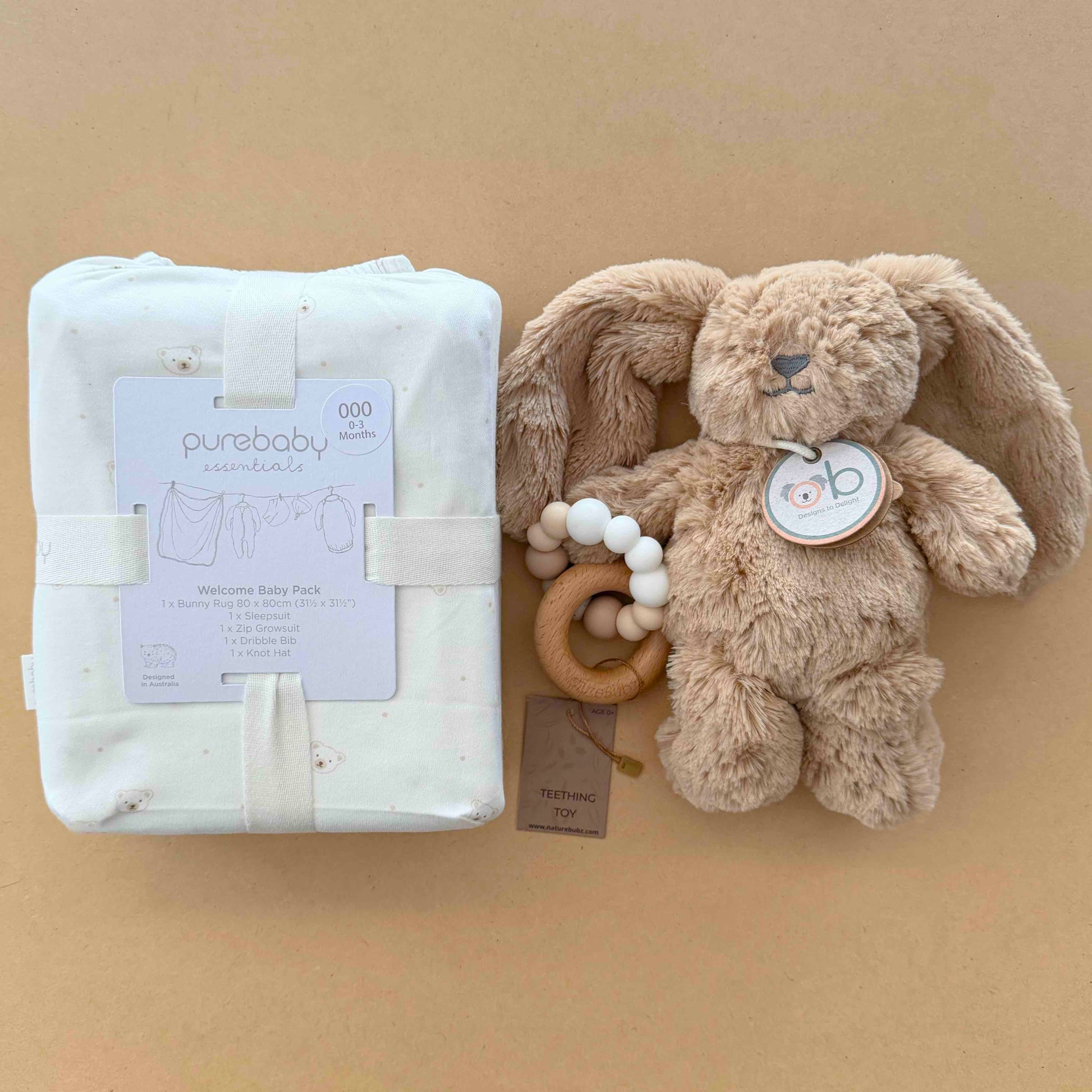 An abundant gift set featuring the 'Welcome Baby Pack' by Pure Baby, filled with five essential items, all in their soft pure organic cotton, including a bunny rug, sleepsuit, zip growsuit, dribble bib and knot hat (beanie). Featuring a neutral palette and cute 'vanilla bear' design.