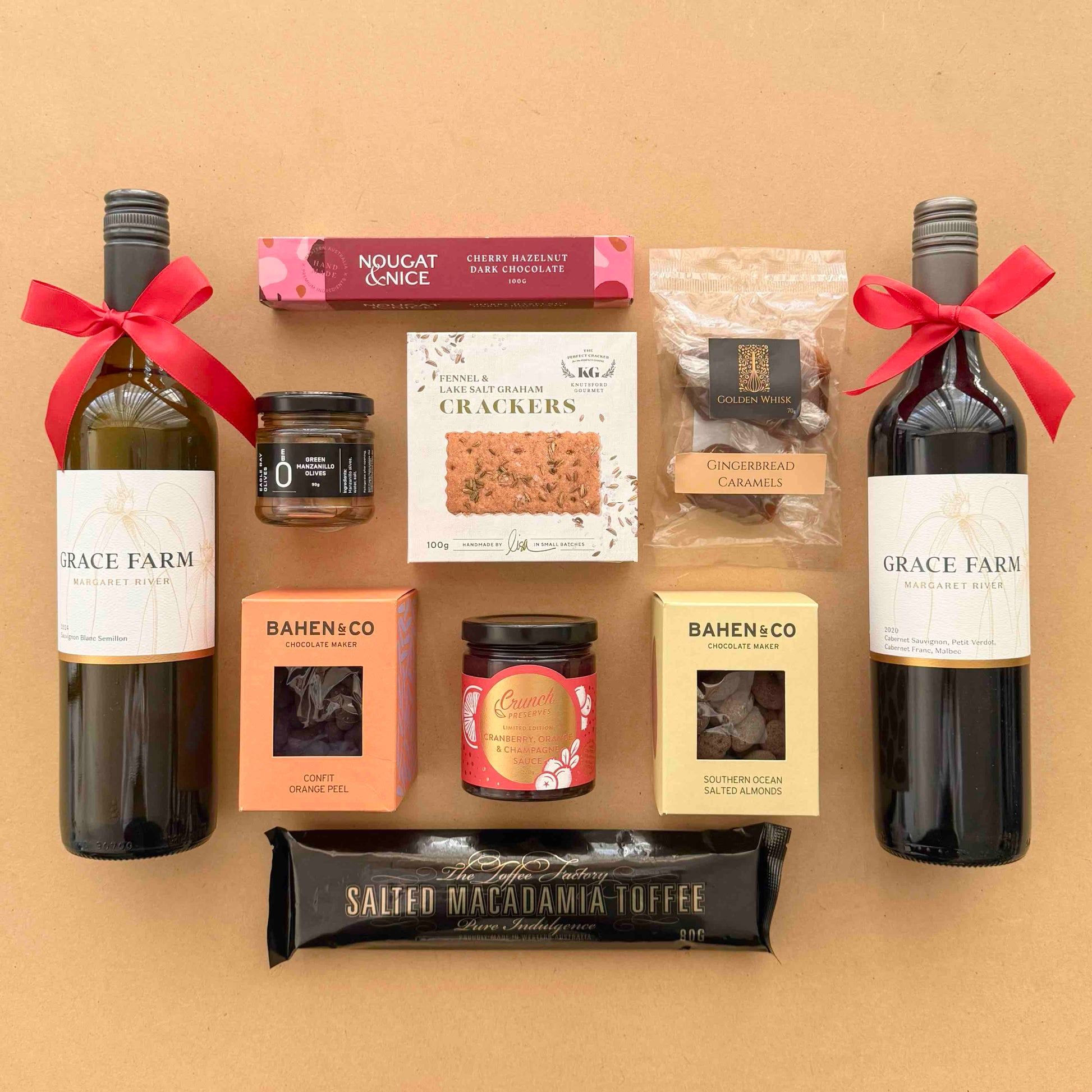 The deluxe edition of our West Coast Christmas hamper, featuring two premium Grace Farm wines, and a host of festive gourmet, artisanal goods.